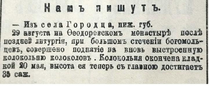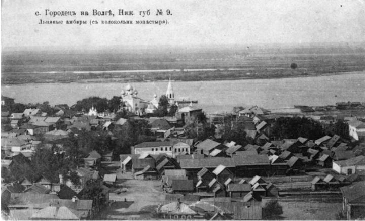 Снимок с колокольни монастыря достаточно точно датируется. Нет никаких сомнений, что А. А. Соколов при первой же возможности поднялся на колокольню, чтобы сделать панорамные снимки Городца, а появилась такая возможность, как только строительство колокольни было завершено. Благодаря газете «Волгарь» мы теперь знаем, что кладку колокольни окончили 20 мая 1903 года, а колокола на нее подняли 29 августа, значит, снимок сделан летом 1903 года.