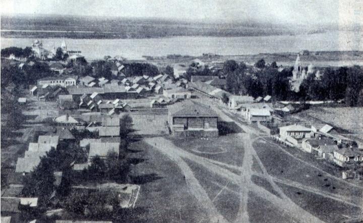 Давайте вместе посмотрим, как выглядела тогда Верхняя базарная площадь. К счастью, сохранилась фотография, сделанная городецким фотографом А. А. Соколовым с колокольни Федоровского монастыря. И хотя объектив камеры был направлен в основном на комплекс Троицкого собора и берег Волги, все же Верхняя базарная площадь с ее льняными амбарами в кадр попала почти целиком. Открытка, на которой была напечатана эта фотография, так и называлась «Льняные амбары (с колокольни монастыря).
